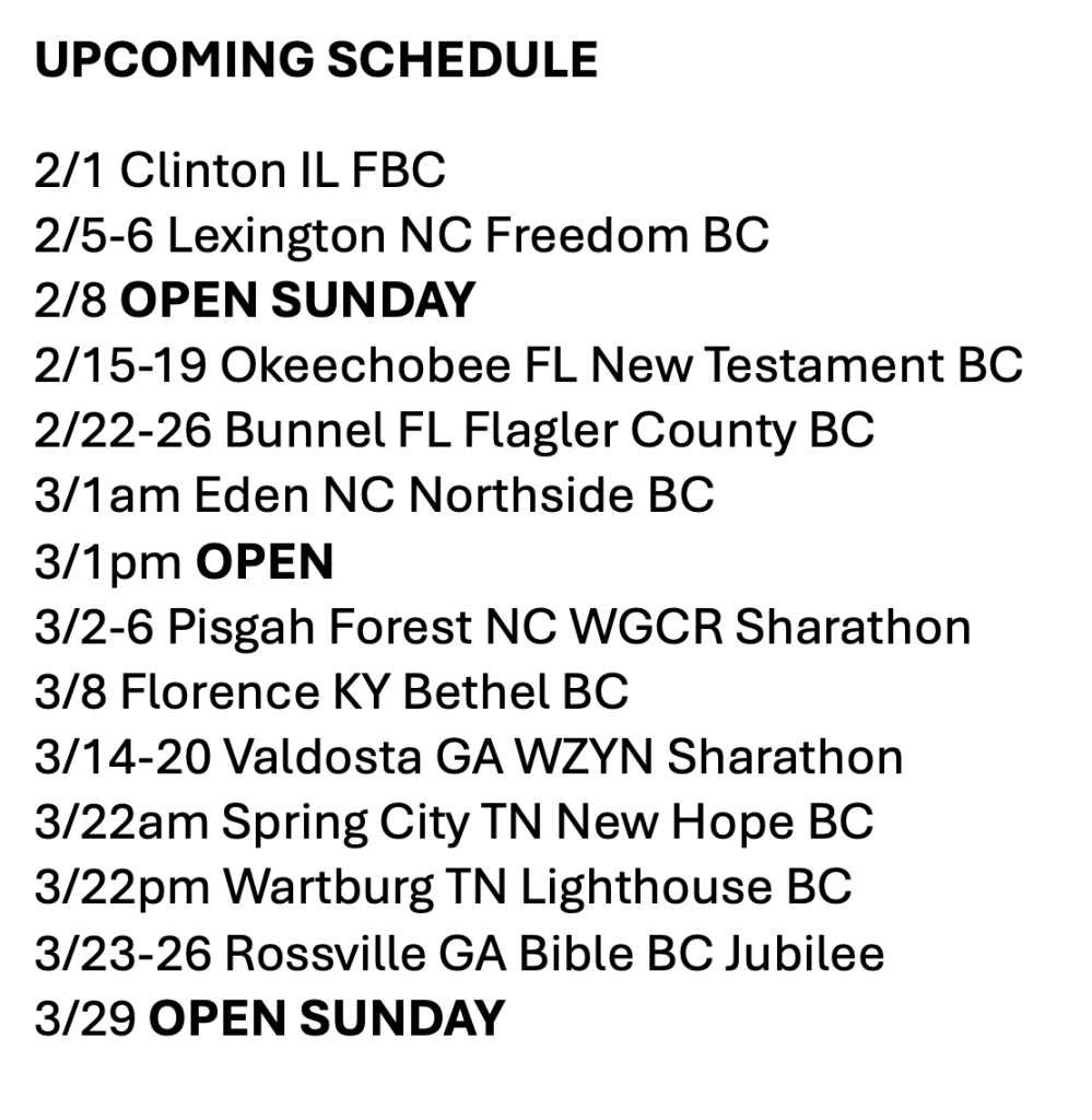 January was a tremendous month of renewal and rededication to the highest purposes for the church and Christians. We had a little lighter schedule than the past year but the quality of our opportunities was strong. We greatly appreciate pastors Graham, Rouse, Raynes, Smith, Turner, and Cornutt for welcoming us to their services. These January meetings have proven to be for me a time of energizing to propel me into the new year. I would encourage anyone to find the recorded services of Fellowship Baptist Maryville TN, Progress Baptist of Hendersonville NC, and Teays Valley BC of Hurricane WV for a wealth of heaven sent preaching from some of God’s choice men. As we slide into February there are many miles to go so we appreciate your stedfast prayers.